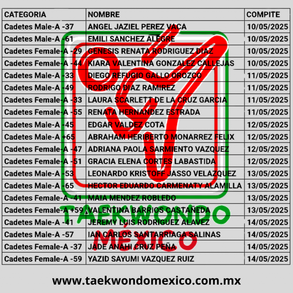 | Cadetes Female-A -37 | Jade Anahí Cruz Peña | IPN / Team Ordoñez Taekwondo |