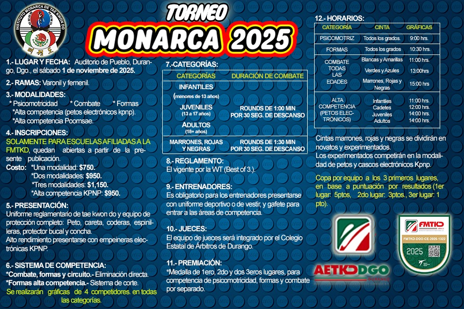 El Instituto Monarca de Tae Kwon Do A.C. te invita al Torneo Monarca 2025, que se llevará a cabo el 1 de noviembre de 2025 en el Auditorio del Pueblo, Durango.